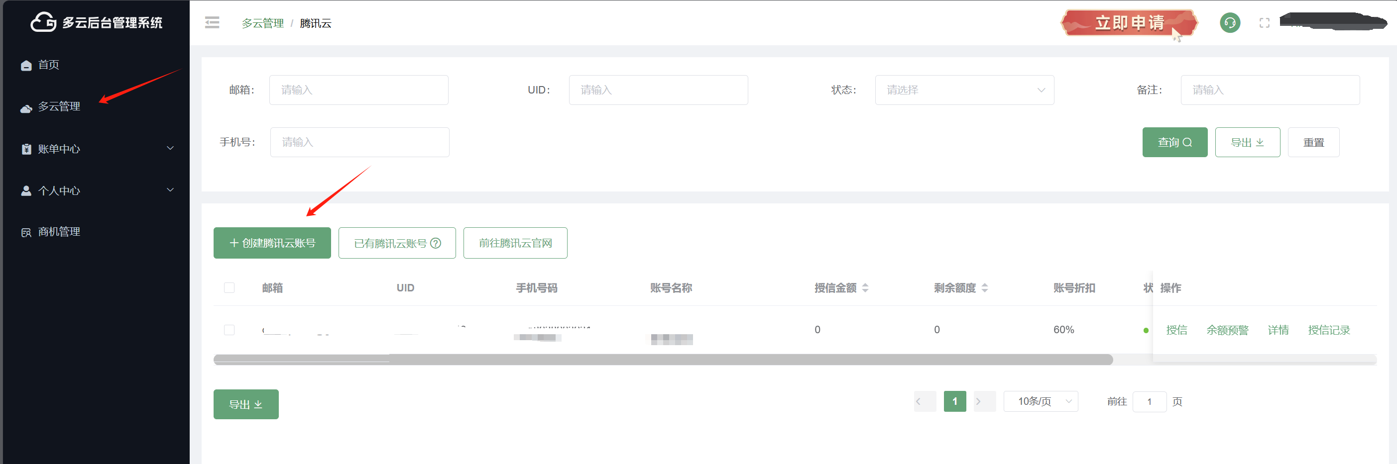 5.返回多云管理平台对腾讯云账号进行自助授信;